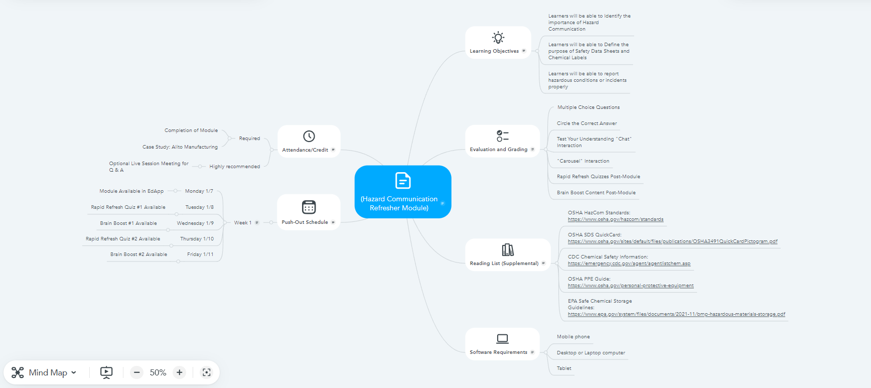 With the Gantt Chart complete and filled out, I begin development on the first module and create a storyboard for the module that represents the different aspects involved including the learning objectives for the module, how the learners will access the content, supplemental resources to provide them within a resources section in the LMS, information regarding evaluation and grading, how learners will receive “credit” for completion, and the push-out schedule for the module. The entire design process can be seen in the image below for Module 1, Hazard Communication.
