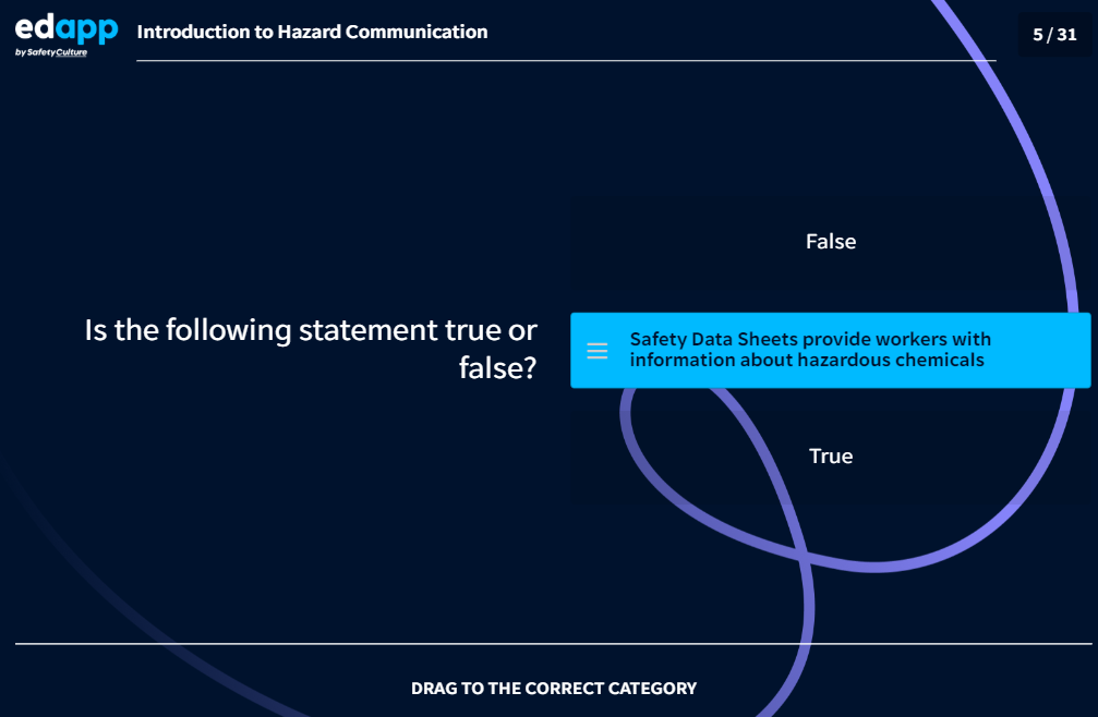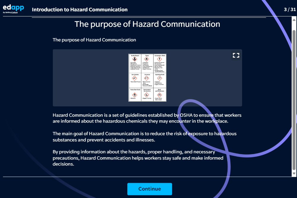 To elaborate on the specific elements for this project, I will show parts of the eLearning module to represent the different categories in the document above. As I said above, EdApp was chosen for this specific client because of the ease of use and all-in-one LMS it offers to meet their needs. The module was designed with the authoring tool and then uploaded to the in-house LMS on the platform. The learner names and emails were added onto a CSV file and bulk uploaded into the LMS. They were then assigned to the Refresher Course Series, with the first module being Hazard Communication.