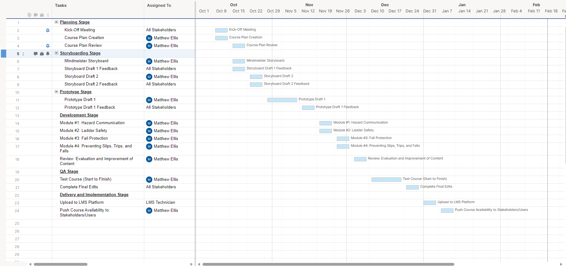 Working with all of the stakeholders would produce timelines and due dates for events such as the Kick-Off meeting, deadlines for Feedback and Review, and other important dates for the different stages of the ADDIE process along the way. In the image below, you can see the Gantt Chart created for this project beginning in October and ending in early January. Meetings with SMEs occur during all stages of this plan due to their involvement in the process and identification of their preferences, learning styles, and needs.