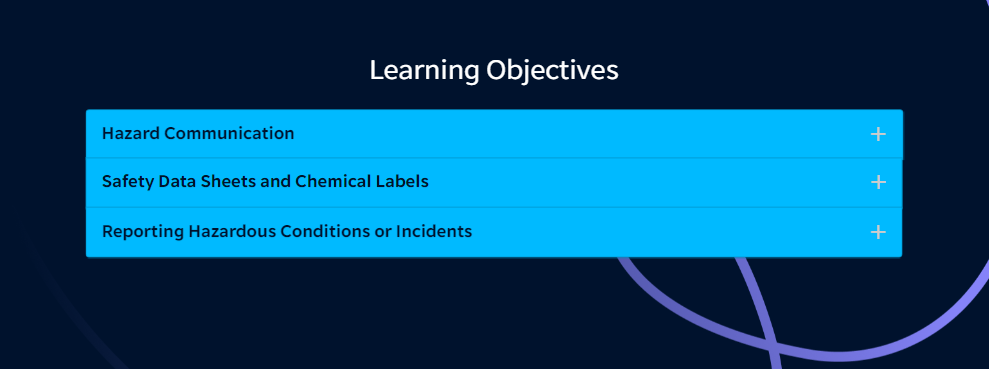 Below, you’ll see a screenshot of the Case Study, which presented a scenario to the learner who then had to utilize their knowledge from the module to assess an incident and provide three key findings as well as three reccomendations for the company in the scenario to follow to be compliant with proper Hazard Communication reporting.